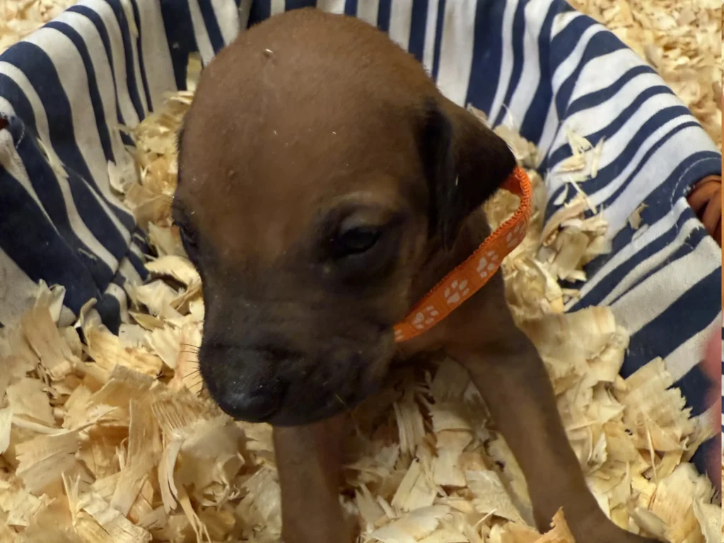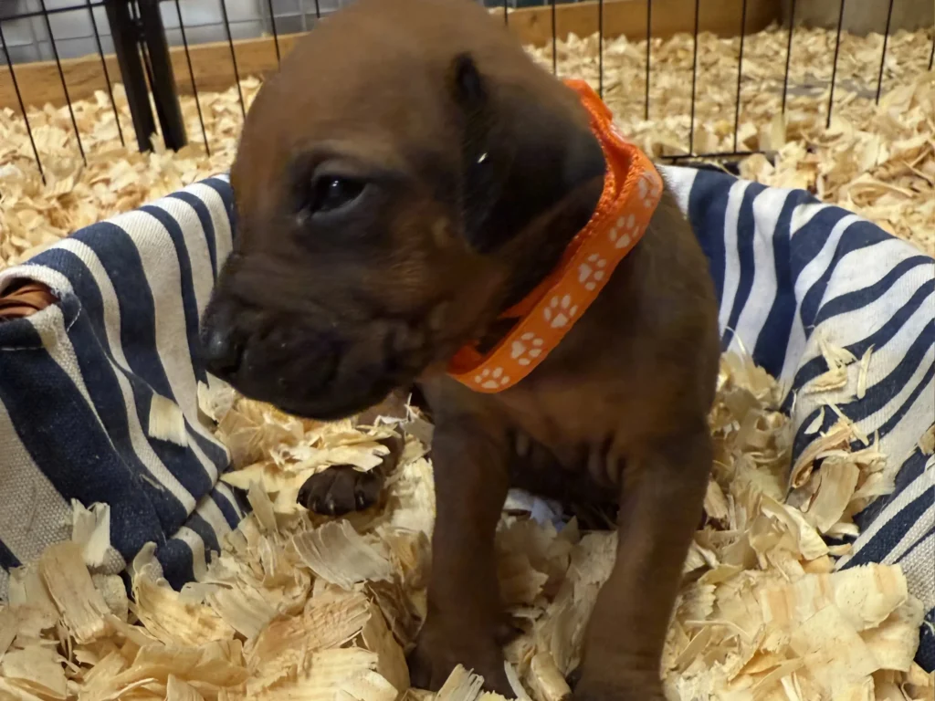 Smart and energetic, Orange is a healthy female Rhodesian Ridgeback puppy bred for quality and care.