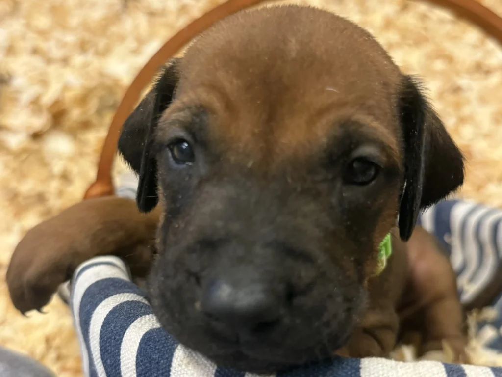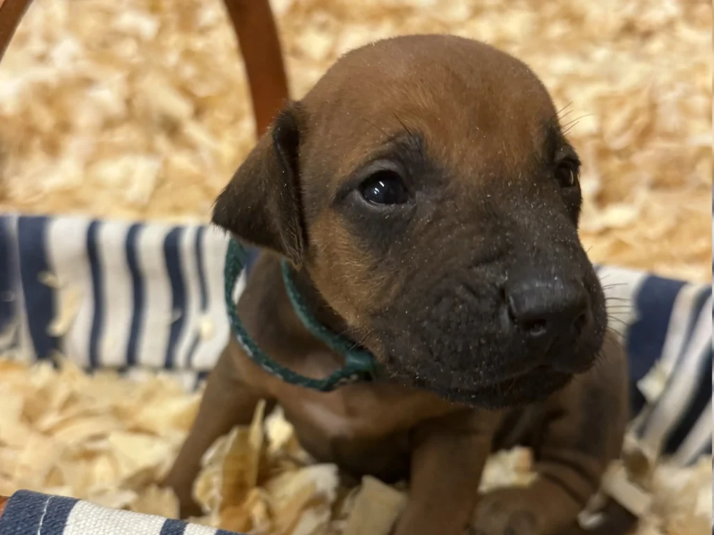 Light Green is a female Rhodesian Ridgeback puppy with a health guarantee, raised with love and attention to every detail.
