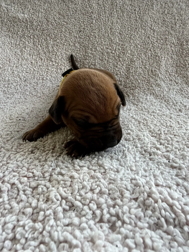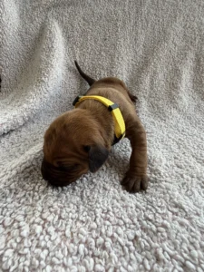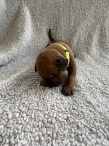 Yellow, a charming female Rhodesian Ridgeback puppy, is perfect for active households looking for a loyal friend.